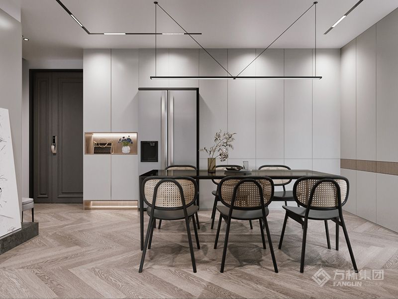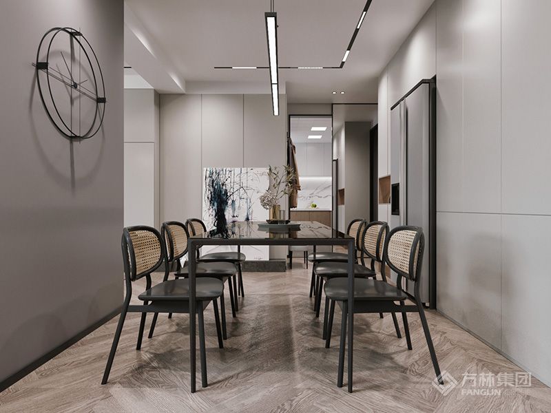 灰色与木色组成了客厅的主要色调。灰色低调、洁雅,木色自然、亲切。两者相得益彰,构成一幅协调温馨的画面。时下较为流行的高级灰为整个空间奠定了简约、素净的基调。